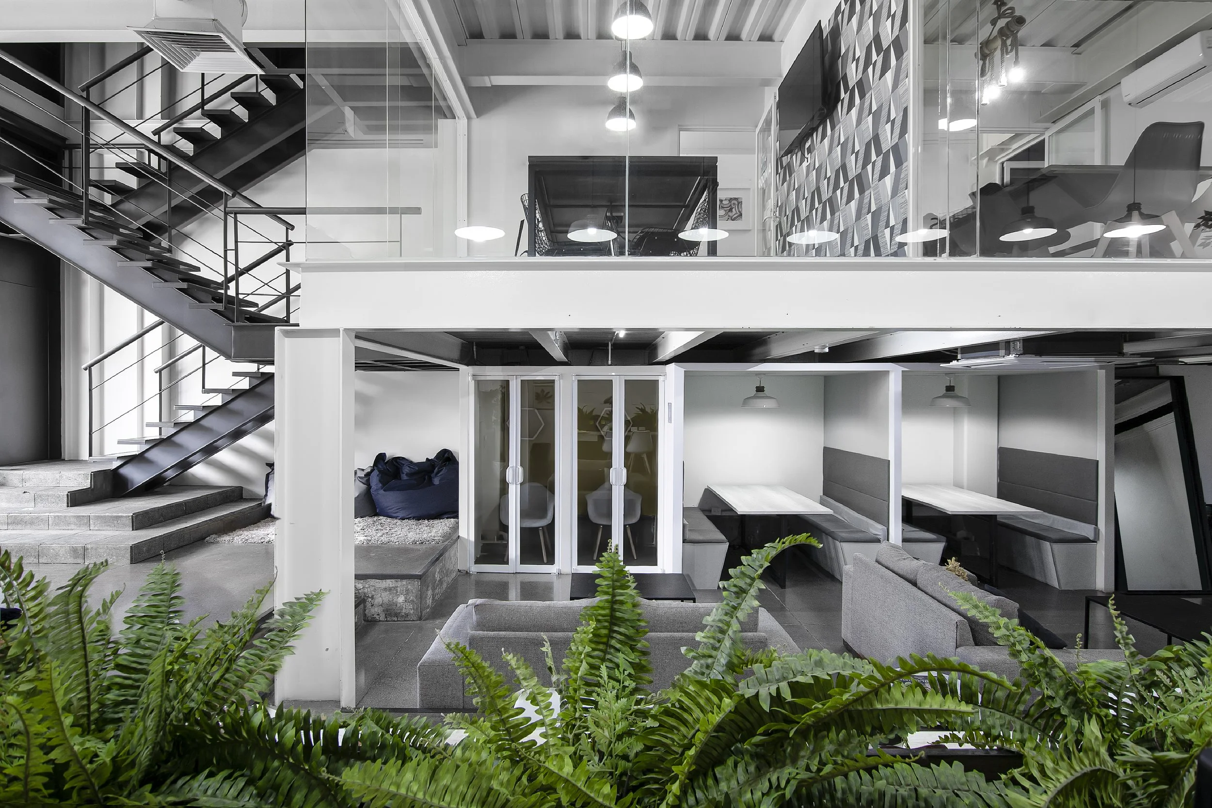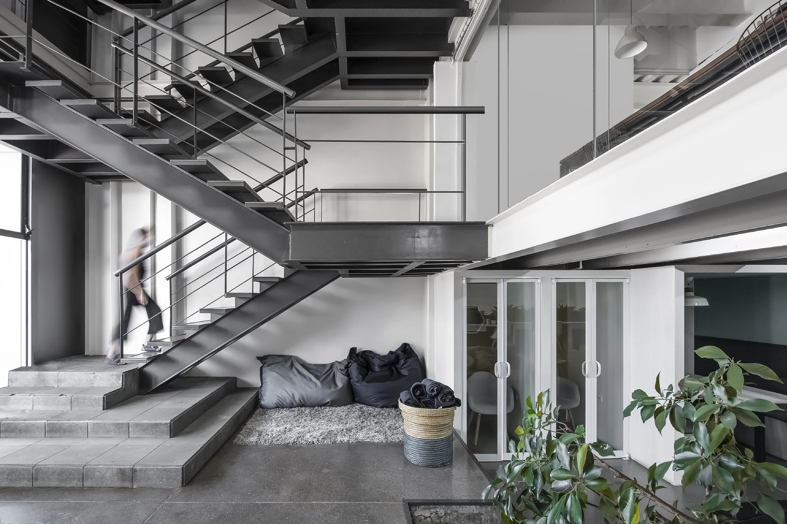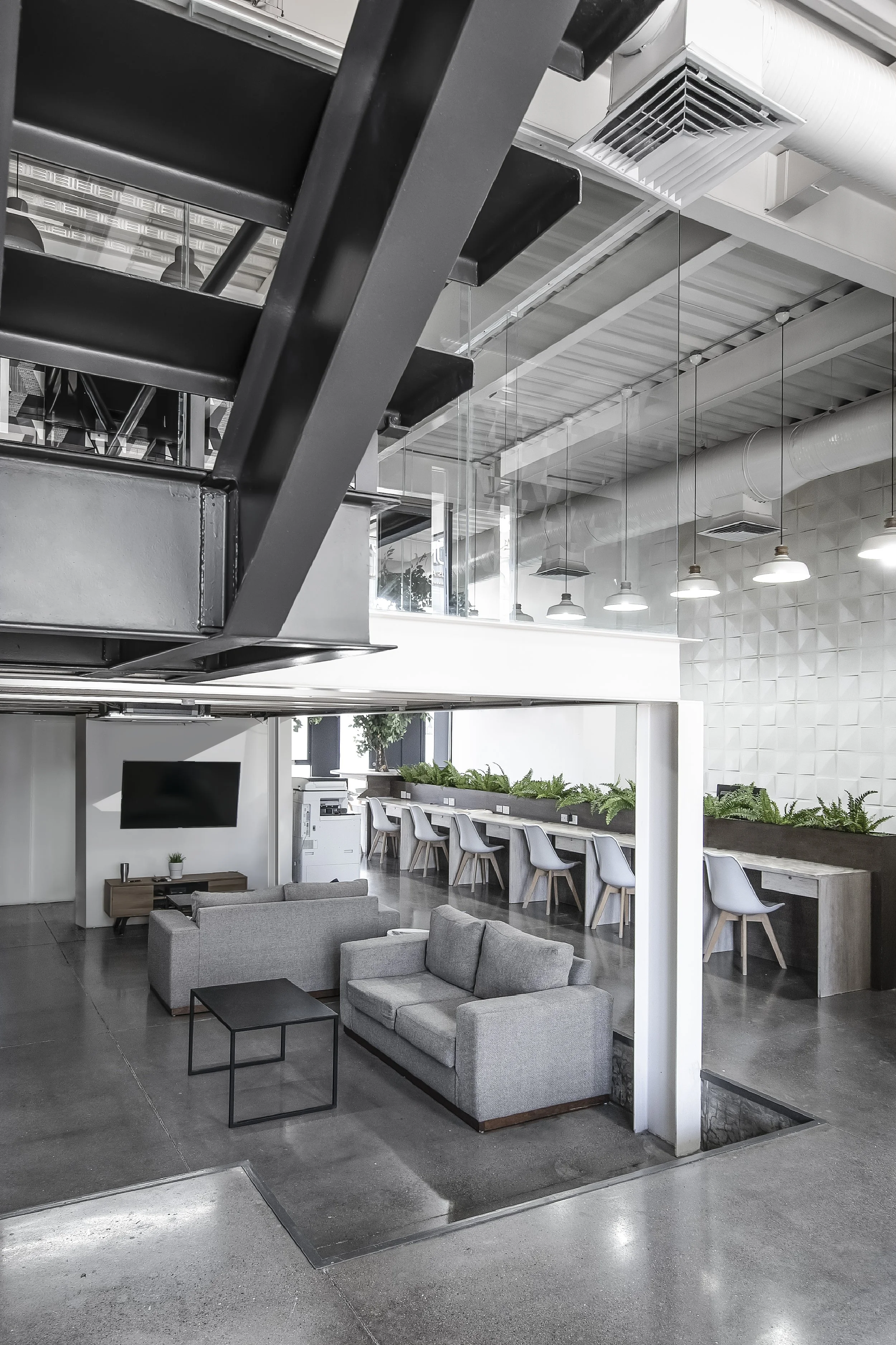 À l’intérieur, le programme accueille des espaces de coworking, des bureaux, des salles de réunion ainsi qu’une terrasse aménagée en roof garden, offrant un lieu de travail ouvert, flexible et lumineux.