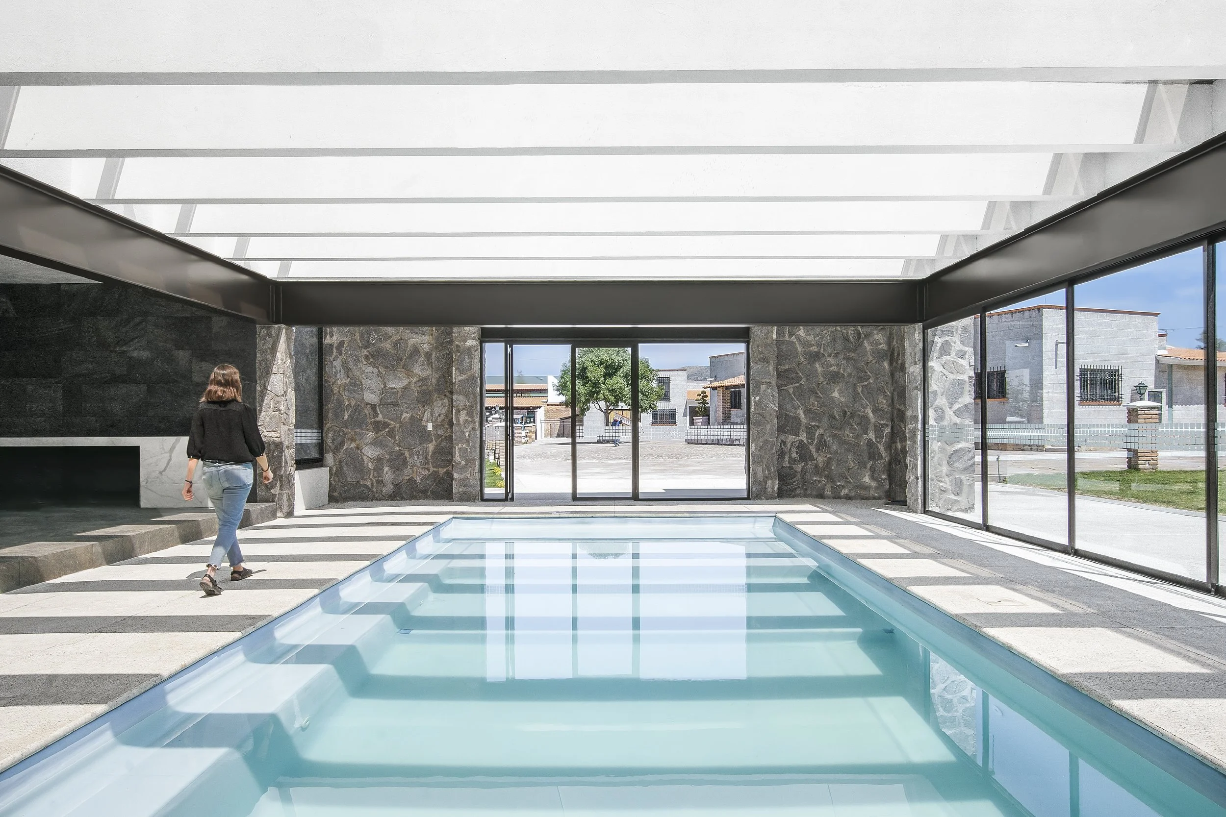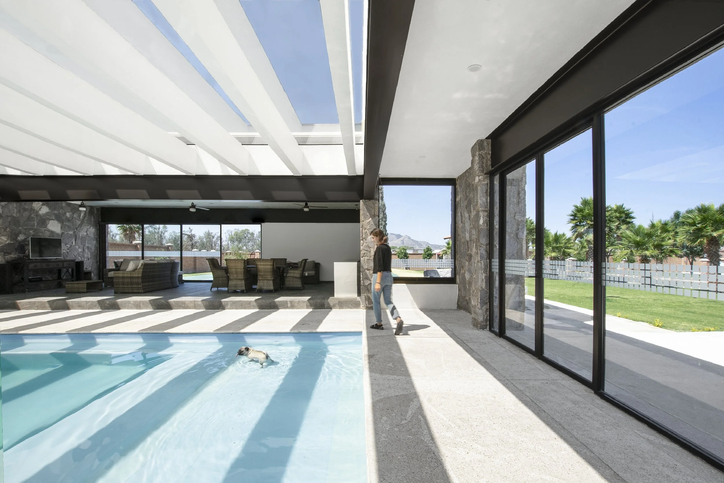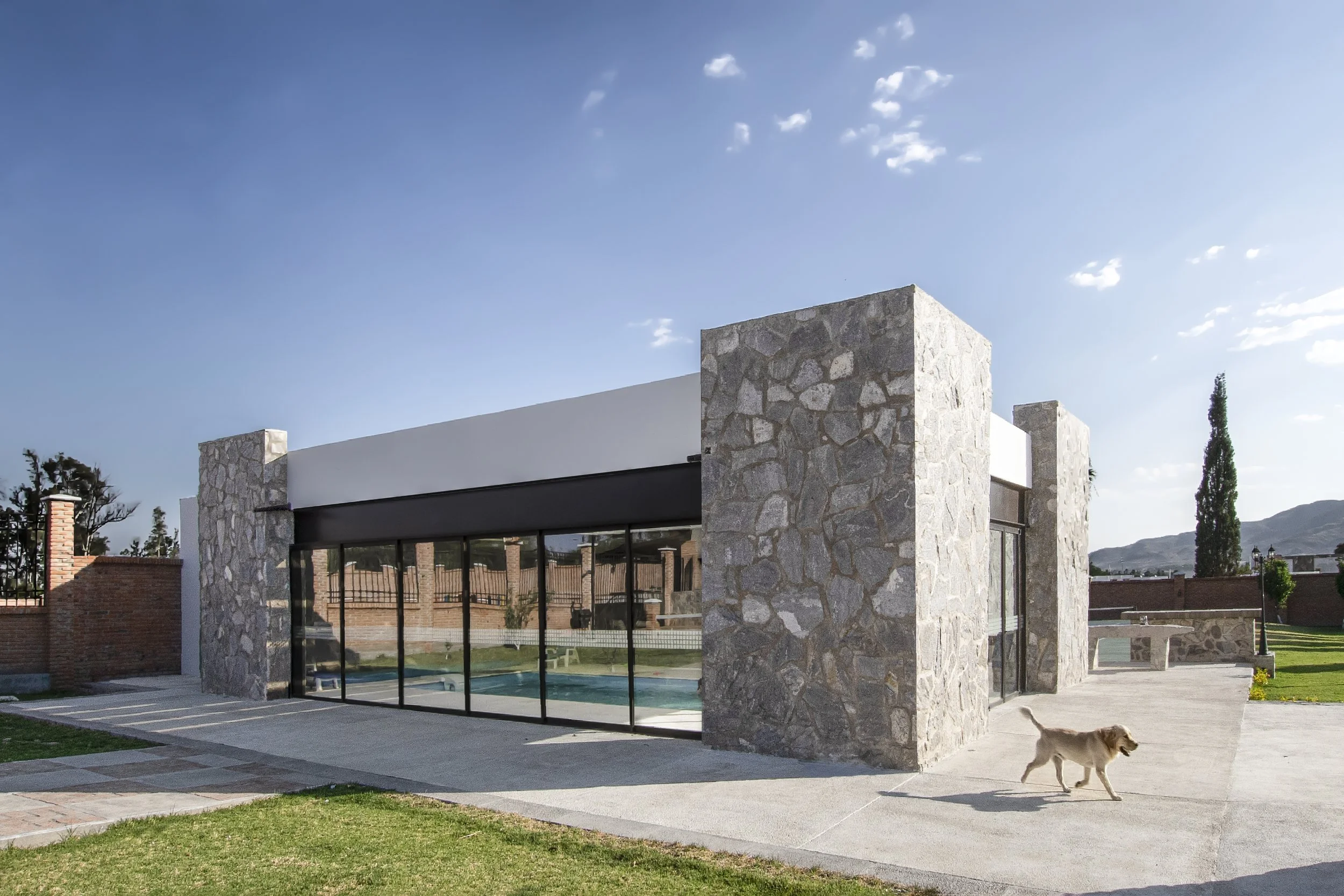 Réunis dans une même composition, la piscine et le court de tennis prolongent l’architecture vers le paysage et structurent la vie extérieure de la résidence. À Aguascalientes, dont le climat est clément une grande partie de l’année, le terrain de tennis devient une extension naturelle de la maison, utilisable en toute saison.